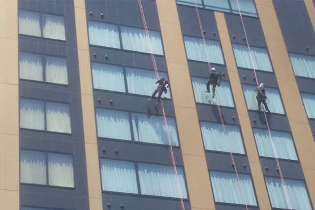 これらの建物のように高所作業が伴うガラス清掃は、安全に作業を進めるために労働安全衛生法でルール化されています。当社はこの法令に則って建物事前調査・記録を行い、調査後には建物作業計画書の作成を徹底しております。